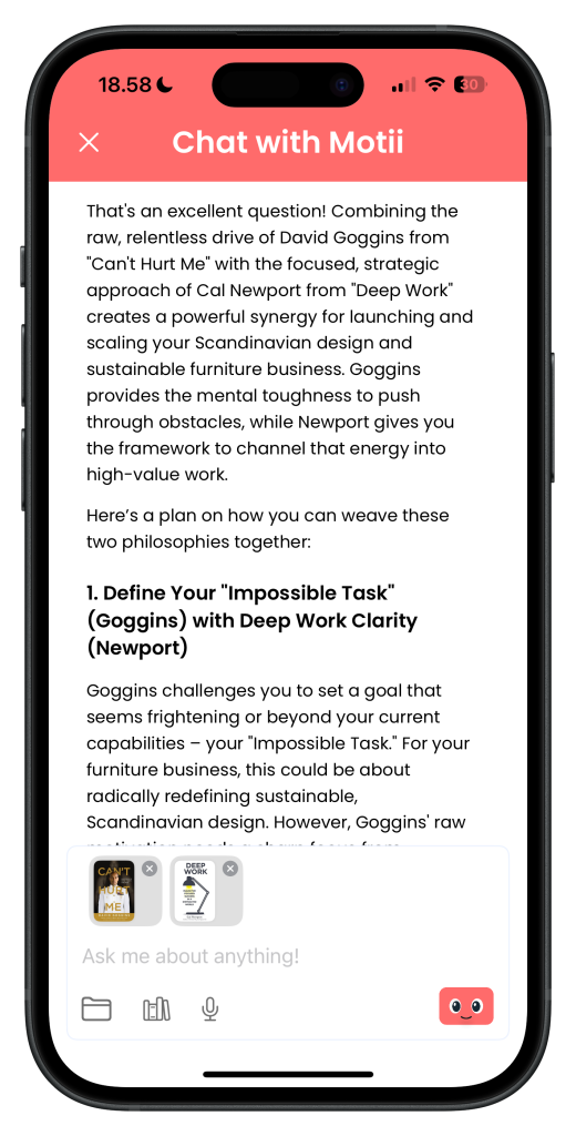 motii. hjælper dig med at bruge det, du læser, hører og noterer — så din viden bliver til fokus og eksekvering, ikke uforløst potentiale.